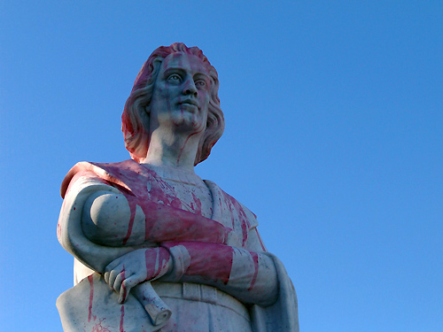 This Italian marble statue was erected in 1979 in Boston’s Christopher Columbus Waterfront Park. On June 2, 2006, the monument was beheaded for the second time. The first beheading occurred in 2002. The statue was also vandalized with paint at least five times in recent years, most notably in 2004 when the word “murderer” was painted across the pedestal and a gallon of red paint was dumped over its head. |