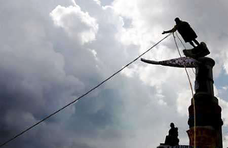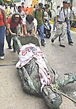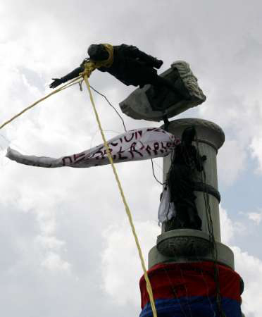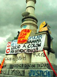 On Columbus Day, October 12, 2004,Venezuelans protesting the 512th anniversary of Columbus’s arrival pulled down a 30 foot, 100 year old bronze statue of Christopher Columbus. The statue was dragged down the street to the Teresa Carreño theatre, where hundreds of indigenous people performed songs and dances, and a symbolic trial was held. After the guilty verdict, the statue was hung upside down from a tree. The statue was repaired, but will not be returned to its original location which has been renamed Avenue Indigenous Resistance (formerly Avenue Columbus). There is discussion of placing the statue in a museum. A documentary film of this event was made. Titled, Abajo el Colonialismo...Pachamama Libre!, it was produced by the Cooperativa Calle Y Media Escuela Pachamerikana: Semillas Liberatrias. |