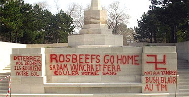 On April 1, 2003, the central cenotaph at the Étaples Military Cemetery, the largest Commonwealth War Graves Commission cemetery in France, was vandalized. Red slogans were spray painted on the cenotaph, including “Rosbeefs [British] go home", "Saddam will win and he will make you bleed", “Death to the Yankees” and "Dig up your rubbish, it is contaminating our soil". |