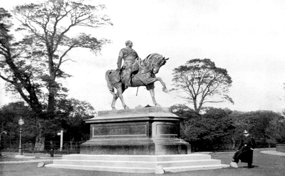 A bronze, equestrian statue of Field Marshall Viscount Gough ('Hammer of the Sikhs') was unveiled on February 22, 1880, in Phoenix Park, Dublin, Ireland. The statue was vandalized on numerous occasions because it was seen as a symbolic celebration of the British empire. On December 24, 1944 the statue of Gough was beheaded and his sword removed. Following that in November 1956, the right hind leg of the horse was destroyed with explosives. On July 3, 1957, the entire statue was dynamited off of its base by the I.R.A. The empty base of the sculpture remained in Phoenix Park and the statue was stored at the Royal Hospital, Kilmainham until August 1986, when it was sold to Robert Guinness on the condition that it left Ireland. In 1990, it was restored by a distant relative of Gough and re-erected at Chillingham Castle, Northumberland, close to the border between England and Scotland. |