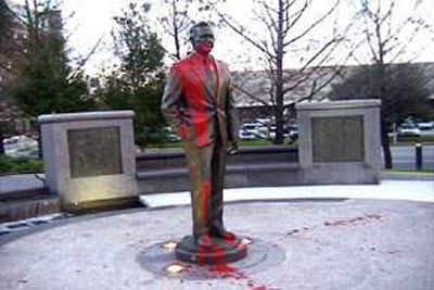 On December 2, 2004, a 1.7 million dollar monument to former U.S. President George Bush Sr. was unveiled at Sesquicentennial Park near the Wortham Center in Houston, Texas. The monument features a stone plaza with 4 bronze bas-relief plaques depicting non-partisan scenes from Bush’s life, an 8 ft. bronze sculpture of him, and quotations from his speeches, timelines, and visitors’ benches. The monument was privately funded and was donated to the city. On Feb. 10, 2005 the sculpture was doused in red paint. Unsurprisingly the statue has witnessed many anti-war / anti-Bush administration protests, including a local anarchist group’s “Inaugurate Yourself, Reclaim the Streets party” held weeks prior to this paint incident. |