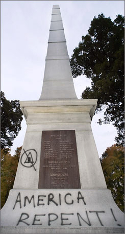 On November 7, 1908, in Battleground, Indiana, an 85 foot marble obelisk was completed and dedicated in honor of the 37 U.S. soldiers killed in the Battle of Tippecanoe (November 7, 1811). On the 196th anniversary of the Battle of Tippecanoe in 2007, the monument was spray-painted with the slogans: “America repent”, "Justice will be served", "Coward", "Give us back our spiritual capital", and "Tecumseh's not dead". |