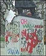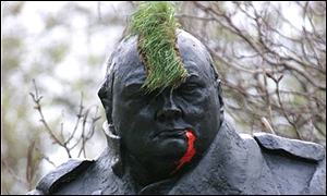 During the anti-capitalist May Day protests in London in 2000, a statue of Winston Churchill in Parliament Square, was daubed in red paint, given a grass mohawk, and the plinth was covered in graffiti. Twenty-five year old Cambridge student and veteran James Matthews admitted to the action and was sentenced to 30 days imprisonment and $250 in fines to the Royal Parks Agency. On January 13, 2007, this same statue was again defaced by red paint poured on its stone plinth. |