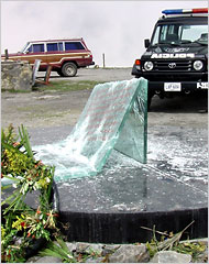 An 8 foot glass plate monument on a circular stone base was erected at the highest point of the Venezuelan Andes, Point Aguila, in the state of Mérida. Venezuelan vice-president Jorge Rodríguez inaugurated the monument on October 8th, 2007. Eleven days later on October 19th, it was shattered by six gunshots and a sledgehammer by the Páramo Patriotic Front, an anti-Communist movement. They left a note at the scene which read: "We don't want a monument to 'Che' Guevara, who is not an example for our children to emulate: he was Minister of Industry in Cuba and finished off all Cuban industries; he was chancellor and isolated Cuba from the rest of the world; he was chief of the Cuban National Bank and bankrupted the country. So, Jorge Rodríguez let your sons be like 'Che' and Chávez's too; but as for our children, we don't want them to be anything like 'Che.'" |