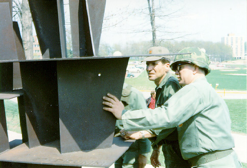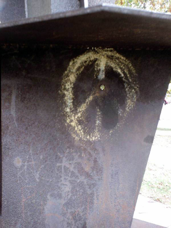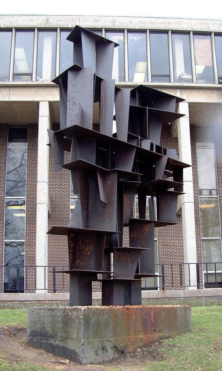 Sculptor Don Drumm’s 15 foot, abstract, cor-ten steel sculpture, commissioned by the Kent State University, was erected on the campus in front of Taylor Hall. On May 4, 1970, the Ohio National Guard opened fire on students protesting the American invasion of Cambodia. Four students were killed and nine others were wounded. During the shooting, a bullet from a Guardsman’s rifle passed through Drumm’s steel sculpture, leaving a still visible hole. The events at Kent State were immortalized in Neil Young’s song “Ohio”. |