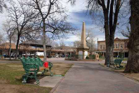 A 33 ft. obelisk was erected on 1867 or 1868, shortly after the Civil War, in recognition of the soldiers who fought at the battles of Valverde and Glorieta Pass. The inscription also states that it honors "the heroes who have fallen in the various battles with savage Indians...” On August 7, 1973, the word “savage” was chiseled off in protest by a “young man with blond hair tied in a pony tail and wearing a hard hat”.* |